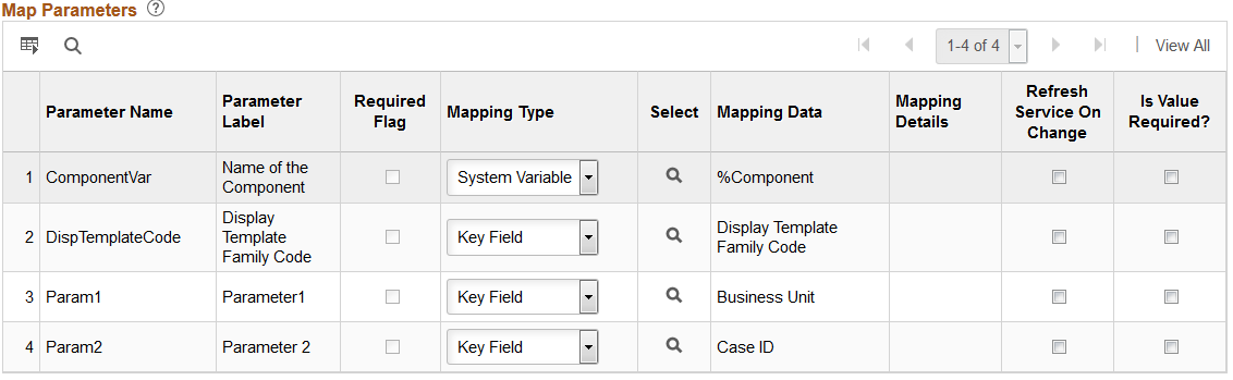 Note: The parameters 1 and 2 has to be left blank for all the Self Service components except Manage Case and Solution Details.