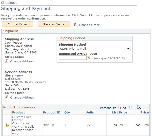 Enter and modify shipping, product, and payment information. CRM Portal Pack must be installed to display the Checkout page. |