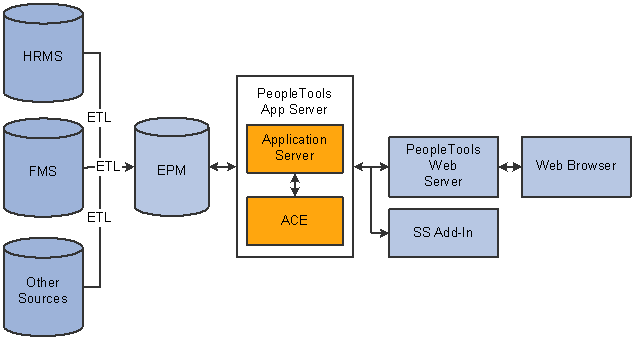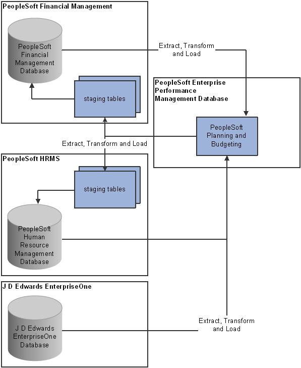 The delivered ETL tool lets you import data from the PeopleSoft Human Resource Management System (HRMS), PeopleSoft Financial Management, and J D Edwards EnterpriseOne databases into the PeopleSoft EPM Warehouses to help you prepare the budget and exchange data between Planning and Budgeting and these PeopleSoft applications: