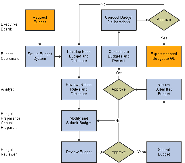 For each organization, the planning process may be an iterative process and it may involve many people at different levels of the organization. The types of activities performed may depend on the individual job responsibilities associated with the specific role. PeopleSoft Planning and Budgeting enables you to set up security based on user roles. Users can be assigned multiple roles that describe their part in the workflow. Planning and Budgeting uses these six roles: