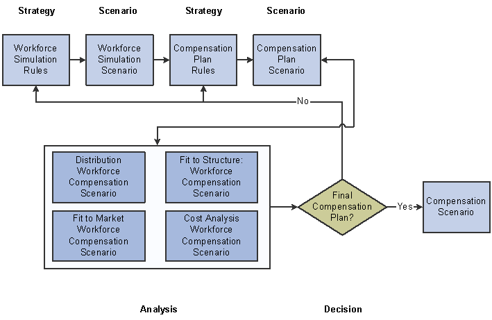 You use the Compensation Strategy module to generate differing scenarios of base and variable compensation plans, as well as any other cost-related plans (such as benefits). We designed the module around two main Application Engine processes, Workforce Simulation (WA_WFS) and Compensation Planning & Simulation (WA_CPS).