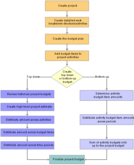 Project Costing supports top-down project budgeting, bottom-up project budgeting, and the ability to adjust existing project budgets. This diagram shows the bottom-up and top-down project budgeting process flow in Project Costing:
