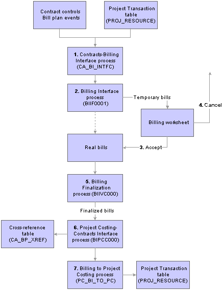 Billing Interface Process (BIIF0001)The Billing Interface process can create two types of bills from the Contracts-Billing Interface process activity—temporary bills and real bills. You clear or select the Pre Approved option to create temporary or real bills for individual billing plans on the Billing Plan - Billing Plan General page in PeopleSoft Contracts.