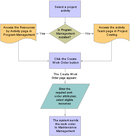 You can create work orders in PeopleSoft Project Costing from active Project Costing-managed project activities by clicking the Create Work Order button on the Activity Definitions - Team page. If PeopleSoft Program Management is installed, click the Create Work Order button on the Resources by Activity page.