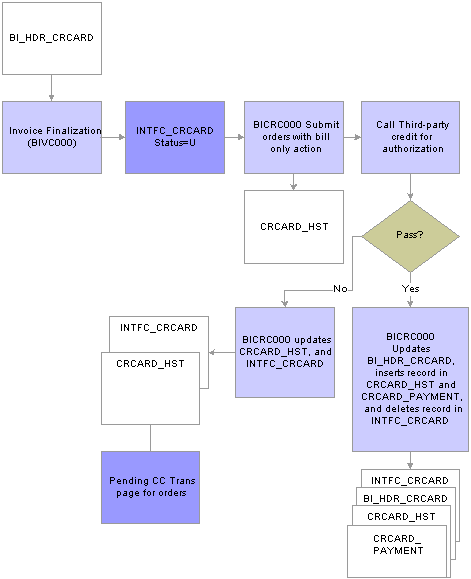 Manual Authorization and Change to Terms. For each of these, it will remove the pending transaction from INTFC_CRCARD, update BI_HDR_CRCARD, and insert a record into the credit card history table. For manual authorizations, BICRC000 inserts a record into the CRCARD_PAYMENT table.