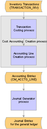 Understanding Transaction Costing and Accounting Entry CreationThe inventory system posts inventory transactions into the TRANSACTION_INV table, then PeopleSoft Cost Management can assign costs to the transactions and create accounting entries. The Cost Accounting Creation process (CM_CSTACCTG) is an application engine process that completes these tasks by launching the: