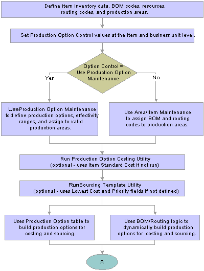 Production options are effective-dated BOM and routing combinations that can be extracted to PeopleSoft Supply Planning and used in production. Once you have defined the BOMs and routings, you can link individual production BOM codes to specific production routings, enabling you to define sets of valid BOM and routing combinations for an item. By specifying an effective and obsolete date for each combination, you can take into account seasonal variations in production. You can also indicate whether the production option is to be included in PeopleSoft Supply Planning, which determines whether the combination is valid in the planning instance and considered in the optimization process. During the optimization process, PeopleSoft Supply Planning recommends a production option based on the due date of the planned order.
