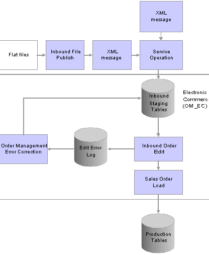 Understanding the Electronic Commerce ProcessThe Electronic Commerce process (OM_EC) is part of the overall inbound electronic commerce flow and is the process that takes items that are loaded in the staging tables and validates the fields that are on the record to insure that the values are correct. The process performs these steps: