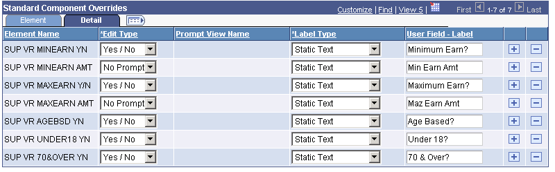 You'll click the Element Name link for ER ADDLSPR and access the Element Detail page, where you will see the modified Supporting Element Overrides group box instead of the delivered group box: