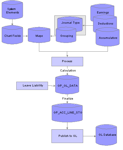 Processing Payroll Data to GLIThe following diagram represents the processing of payroll data for the GLI. The two shaded boxes with borders show up the added local functionality. The selected check boxes represent the options on the processing page. Note that the Leave Entitlement option updates data in the GP_GL_DATA table for inclusion in the output to the GLI.