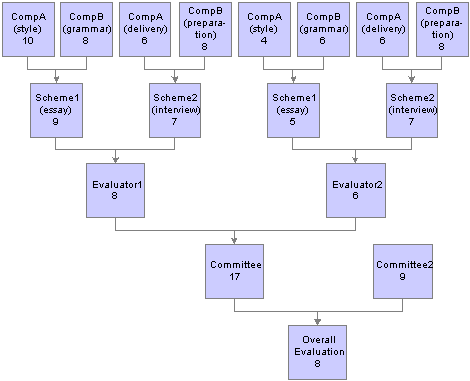 For example, suppose you assigned two committees to evaluate an applicant. One committee is to evaluate essays and interviews, and the second committee is to evaluate other materials (for simplicity we will not look at the details of the second committee). The first committee consists of two committee members (or evaluators). Each evaluator evaluates two schemes: the undergraduate essay and the undergraduate interview. The evaluators evaluate the style and grammar components of the undergraduate essay scheme, and they evaluate the delivery and preparation components of the undergraduate interview scheme.