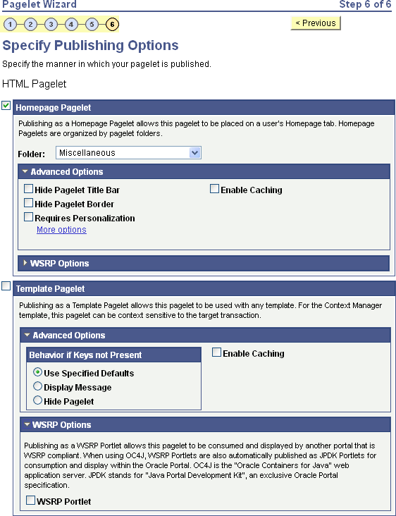 This section provides an overview of caching options and discusses how to specify pagelet publication options. This is step 6 in the Pagelet Wizard pagelet creation process.