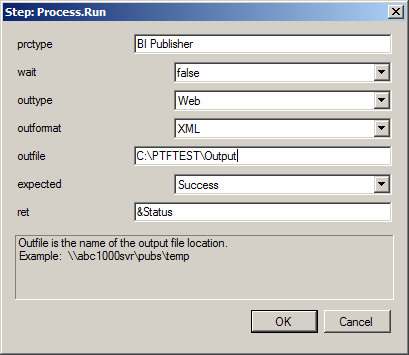 For any step type/action that includes parameters, you can press the F4 key or double-click in the Parameters cell to display and enter the parameters. For each parameter, an explanation and example are displayed. This is an example of the step Process.Run: